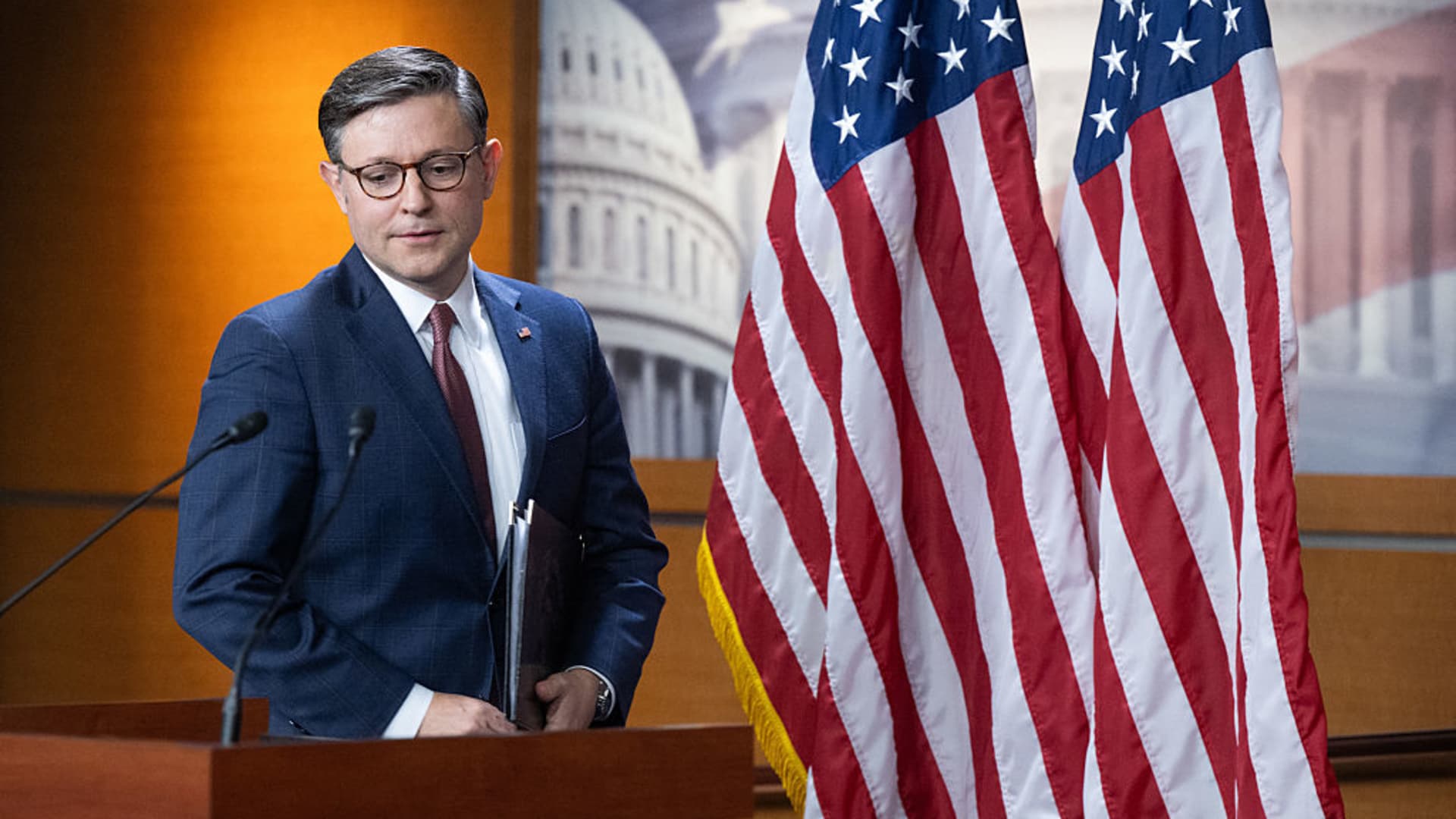 US Speaker of the House Mike Johnson, Republican from Louisiana, speaks during a news conference after a House Republican conference meeting on Capitol Hill in Washington, DC on June 4, 2025.