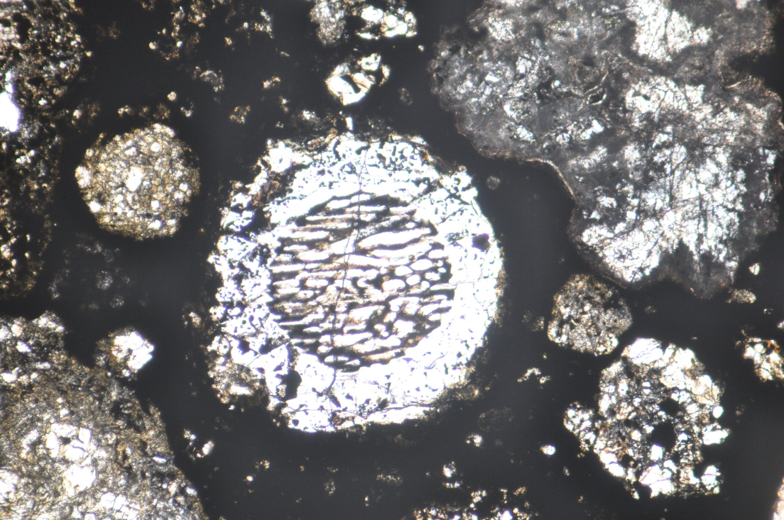 Round chondrules visible in a thin section of the Allende meteorite under microscopic view. Credit: Akira Miyake, Kyoto University