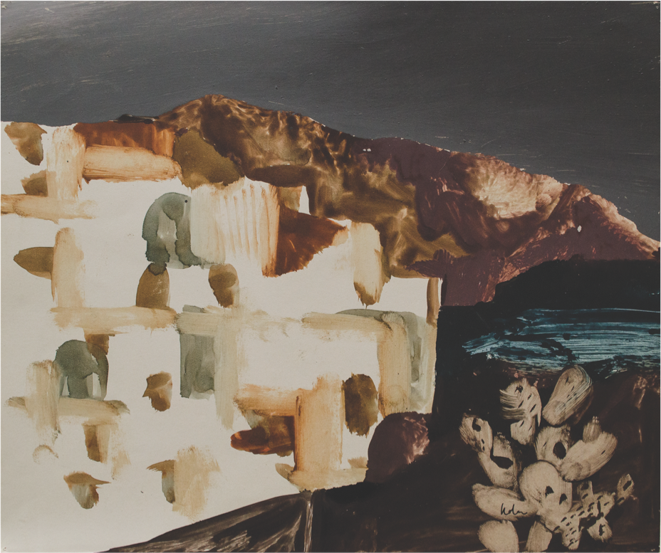 Nolan’s visit was intended to be a brief one, but days turned to weeks and they did not leave Greece for another six months. During his stay on Hydra, Nolan’s interest in Greek history deepened and he became fascinated by Classical sculpture, literature and the representation of ancient Greek warriors on vases. His interest in mythologies, doomed heroes and anti-heroes, already evident in his Ned Kelly and Burke and Wills paintings, took on another layer of meaning.