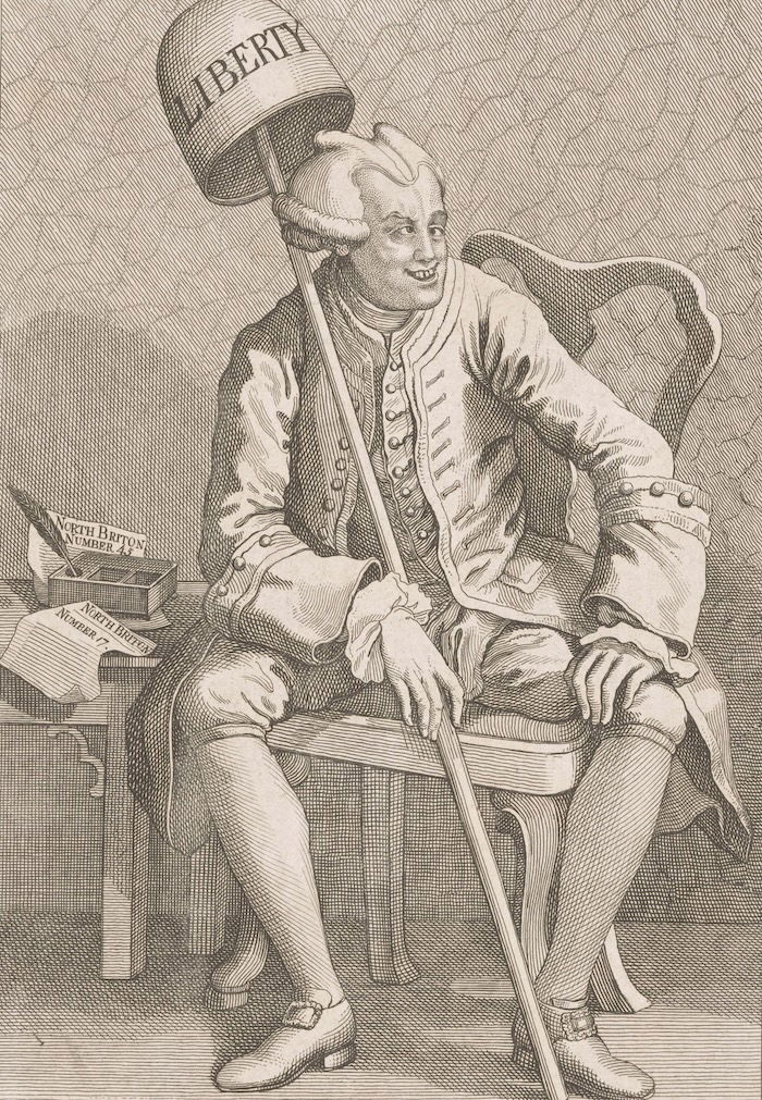 Wilkes’ interactions with his support base exhibit the same contradictions. The product of a wealthy merchant family from London, he was educated at Leiden University, where he rubbed shoulders with future politicians. Wilkes came to popular attention as a result of his editorship of the North Briton, dedicated to attacking George III’s favourite, the earl of Bute. The inflammatory tone of issue 45 had brought the full force of the government down on the paper and, in 1763, triggered a series of legal actions which saw Wilkes imprisoned in the Tower of London. Hailed as a champion of liberty on his release, he chose exile, and was later outlawed, becoming a celebrity in the process.